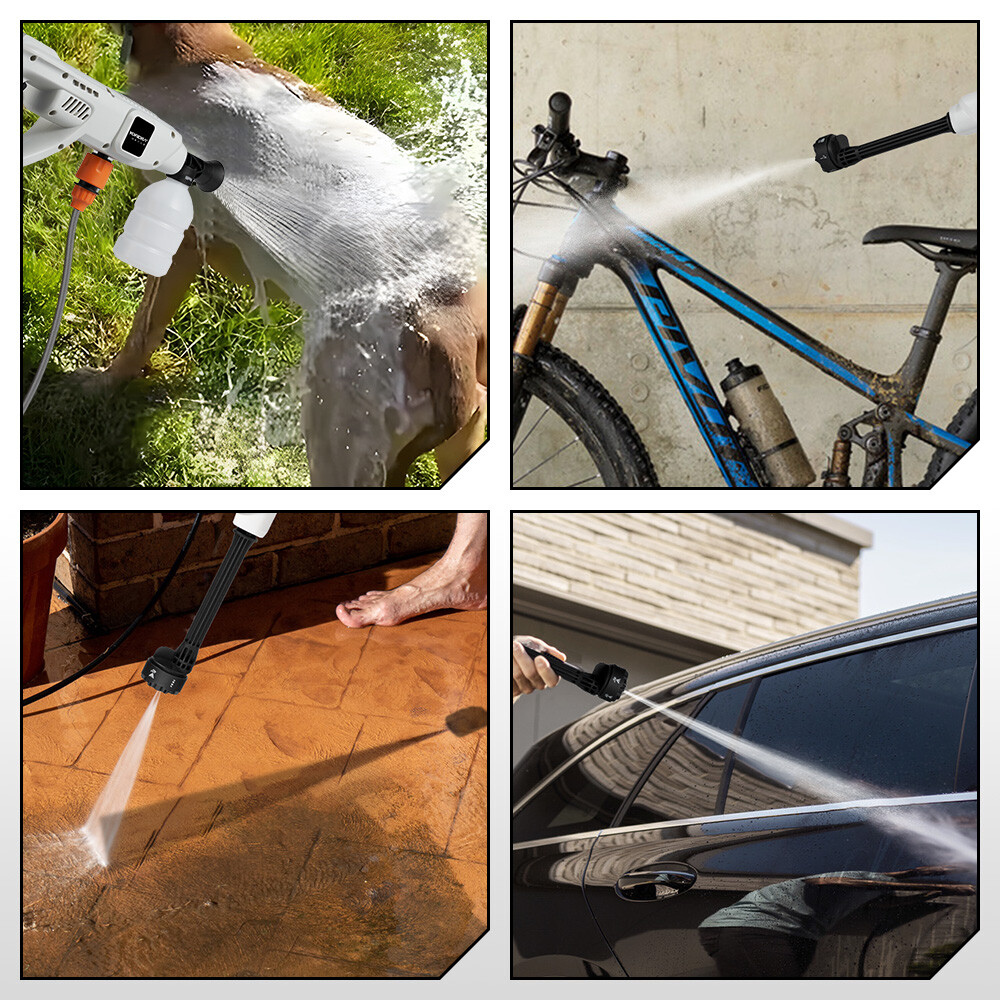 【Application】This ideal high pressure washer for car cleaning, removing stubborn dirt from outdoor household surfaces, gates, benches, garden furniture, steps, and swimming pools. A portable car washer is also the perfect gift for yourself, your friends, and your family.